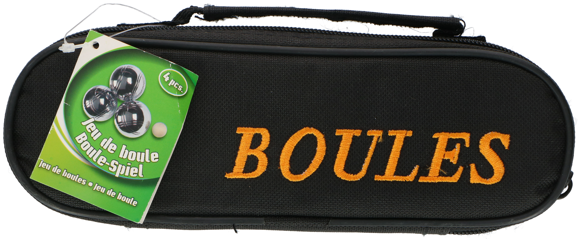 Boules-Set bestehend aus 3 Metall-Spielbällen bzw. Kugeln mit 7 cm Durchmesser, Messschnur, Holz-Zielkugel mit 3 cm Durchmesser und eine Tragetasche.