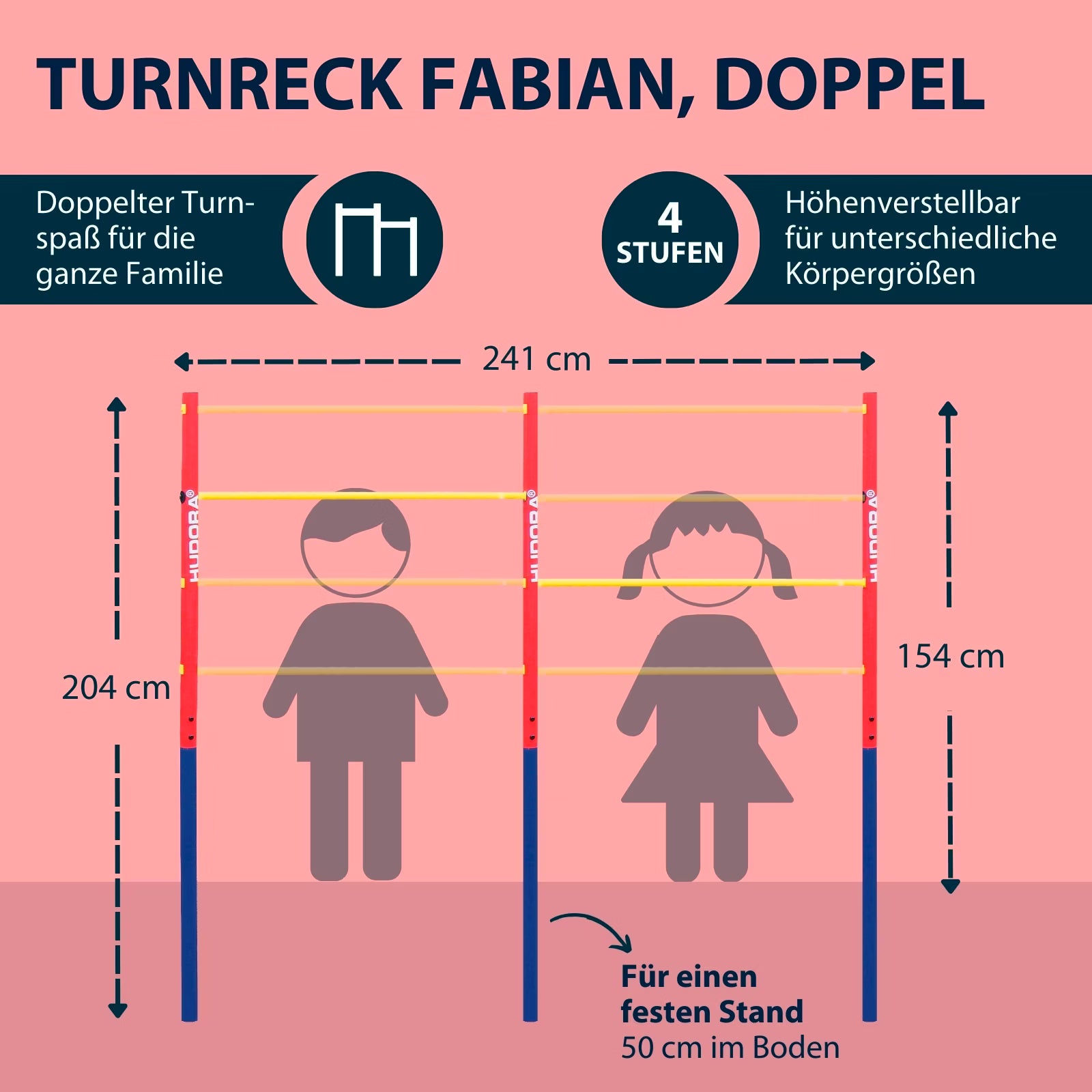Two height-adjustable horizontal bars allow for year-round play and gymnastics. Upswing, downswing, and dangling: Exercises on the horizontal bars playfully support children's physical development and coordination skills. The cross-reinforced horizontal bar mounts of this GS-tested product ensure the extra safety of the horizontal bars. Four adjustable heights from approximately 71.5 to 150 cm and freely adjustable angles of up to 80° ensure that the outdoor fitness equipment can be adapted to individual gymnastics preferences. The 25 mm diameter bar and the 118 cm long horizontal bars are perfectly suited to children's heights. The assembled Fabian Double Set measures 154 x 241 cm (+ 50 cm in the ground) and can support up to 100 kg. This allows two children to do gymnastics at the same time. Mounting materials for safe assembly and concreting are included in the set.