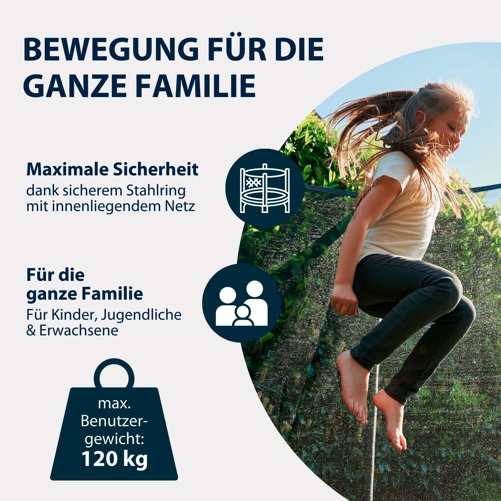 Und das Beste: Das Trampolin First 300 gibt nicht nur Kids das herrliche Gefühl, für einen kurzen Moment federleicht zu sein. Auch Erwachsene können bei einem Benutzergewicht bis 120 kg locker ein paar Hüpfer wagen. Kein Wunder, dass ein Trampolin bei Vielen ganz oben auf der Liste steht. Denn darauf lässt es sich nicht nur prima sporteln, sondern genauso gut chillen und entspannt in die Sonne blinzeln.