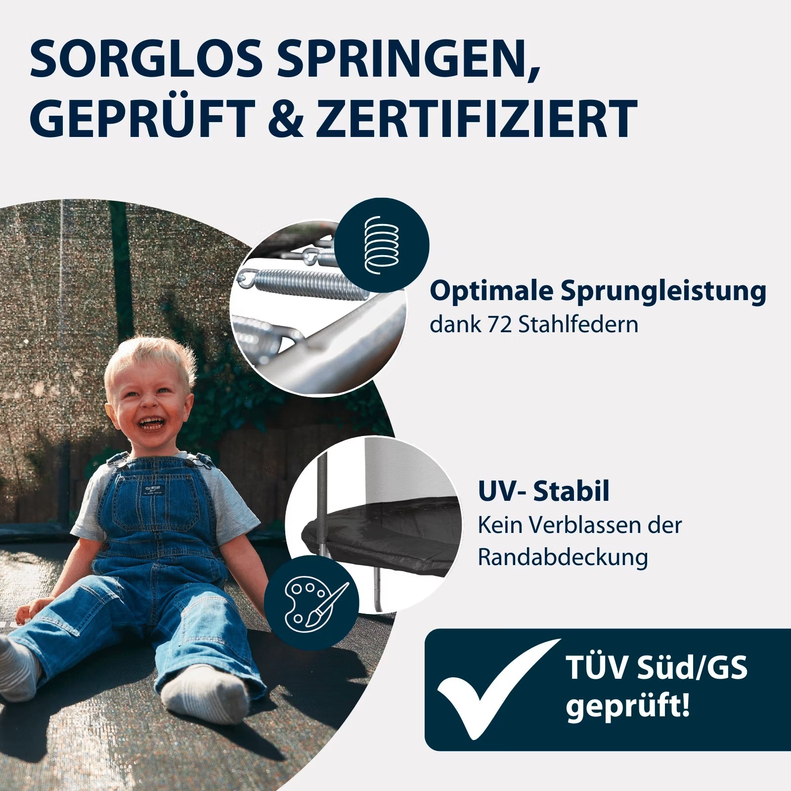 Ready, set, go! Das Trampolin First 400 ist die richtige Wahl für sicheres Hüpfvergnügen. Das innenliegende Fangnetz lässt sich ganz einfach oben am Stahlring straff befestigen. So können selbst die wildesten Akrobaten unfallfrei hüpfen und toben. Die extrem standsichere 12 Bein-Konstruktion und der breite Schutzrand, der die Federn komplett abdeckt, gehören zu den hochwertigen Details. Genauso die 72 Federn selbst, die für Mega-Sprungkraft sorgen. Mächtig Stabilität erhält dieses Modell durch den feuerverzinkten Metallrahmen, inklusive der acht gepolsterten Hauptstangen.