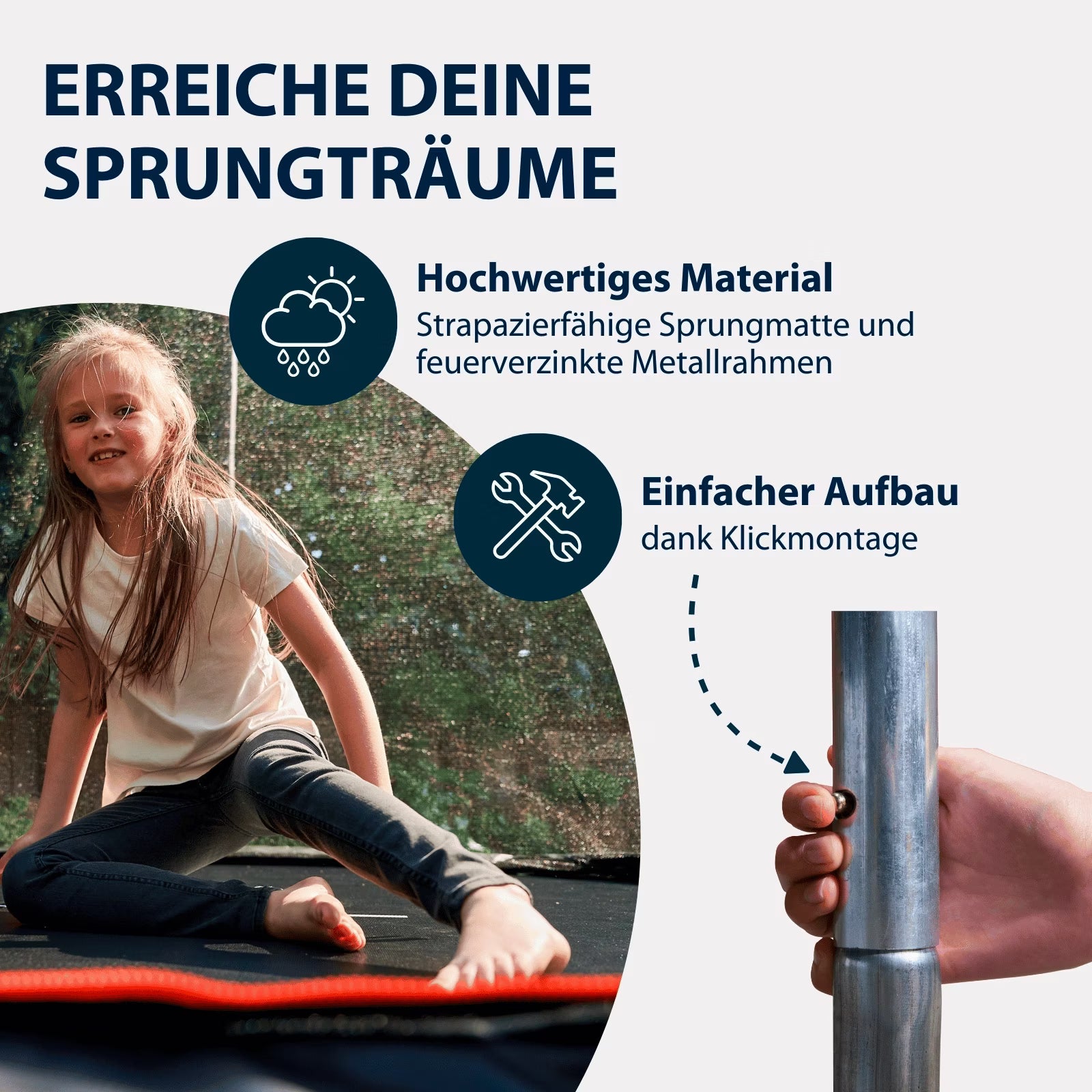 Und das Beste: Das Trampolin First 400 gibt nicht nur Kids das herrliche Gefühl, für einen kurzen Moment federleicht zu sein. Auch Erwachsene können bei einem Benutzergewicht bis 120 kg locker ein paar Hüpfer wagen. Kein Wunder, dass ein Trampolin bei Vielen ganz oben auf der Liste steht. Denn darauf lässt es sich nicht nur prima sporteln, sondern genauso gut chillen und entspannt in die Sonne blinzeln.