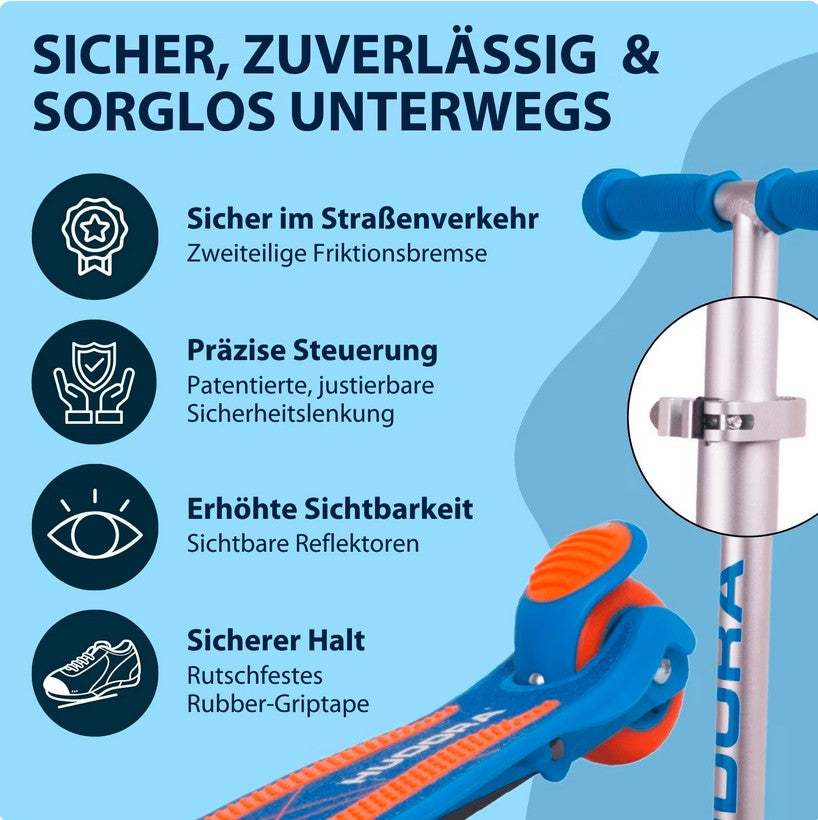 Fun and safety should go hand in hand, especially for the very young. With two wheels at the front and one at the back, the HUDORA Flitzkids 2.0 ensures a safe introduction to scooter riding. The adjustable safety steering and the extremely robust two-component deck, which guarantee stability, make the HUDORA Flitzkids 2.0 perfect for beginners. With two wheels at the front and one wide wheel at the back, even the smallest racers get their money's worth. The anodized handlebar is equipped with a click lock and is removable. This allows this scooter to be transported in a space-saving manner. Safety handlebars and a two-part friction brake are further features of the HUDORA Flitzkids 2.0, which ensure maximum safety during handling. The scooter has assembled dimensions of approximately 59 x 28 x 66 cm, and the height-adjustable handlebar has a play of 51 to 66 cm. It thus adapts practically as the child grows.