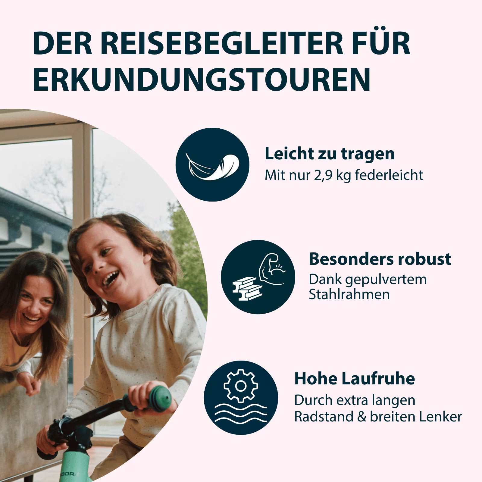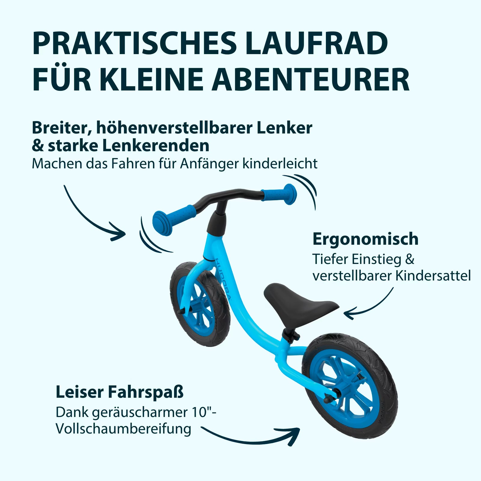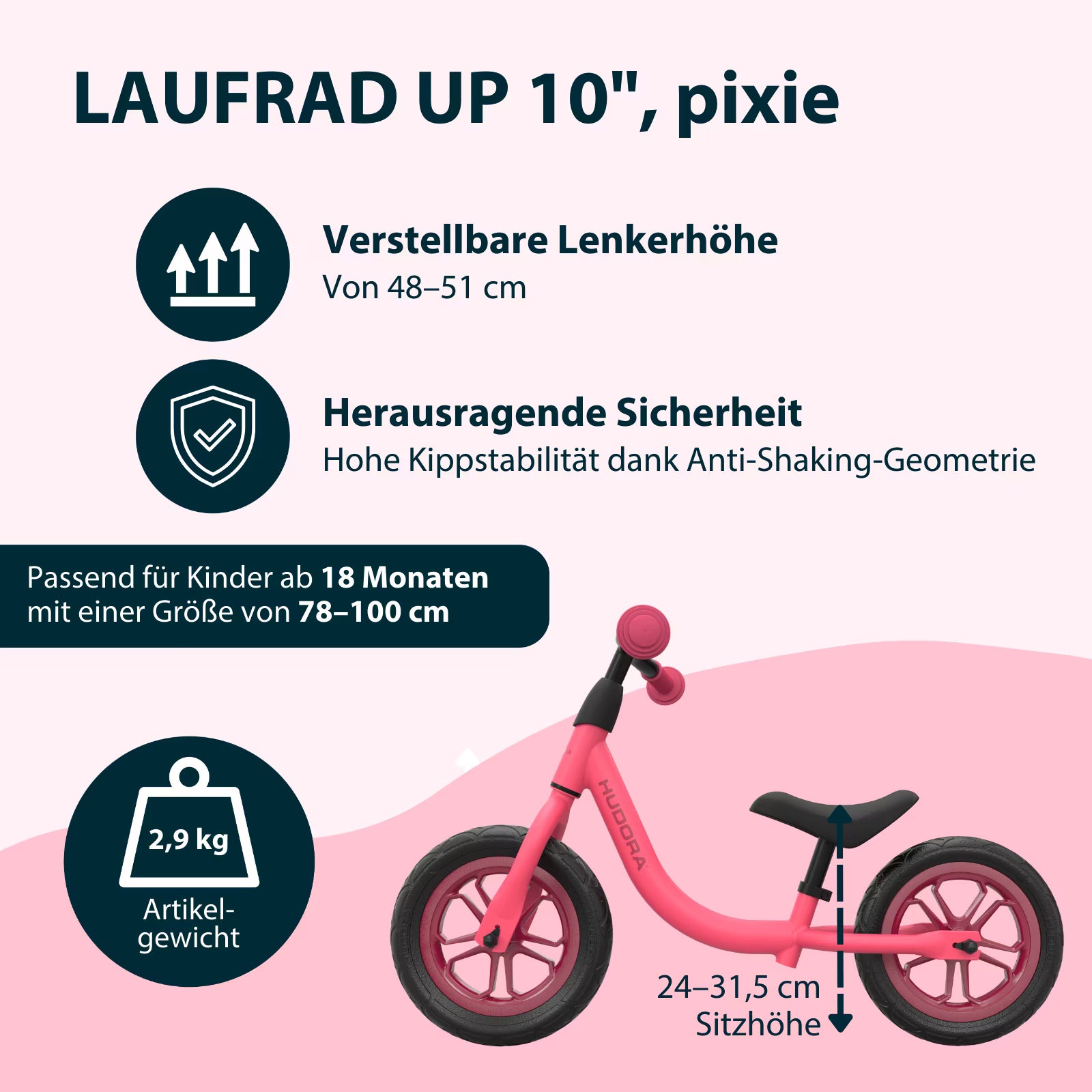 The Up 10" balance bike is here, combining classic design with clever functionality! This balance bike was specially developed for children 18 months and older and grows with the little riders all the way up to preschool age. Thanks to its sophisticated "anti-shaking geometry," the Up 10" balance bike offers a particularly stable and smooth ride. The long wheelbase and wide handlebars ensure a secure hold, while the larger front wheel easily overcomes small obstacles – perfect for those first outdoor trips. Another highlight: the adjustable seat height. It adapts to the current body size and always gives little ones an optimal and safe riding experience. The extra-low step-through makes getting started easier and makes mounting child's play, so even the youngest children can roll right away.