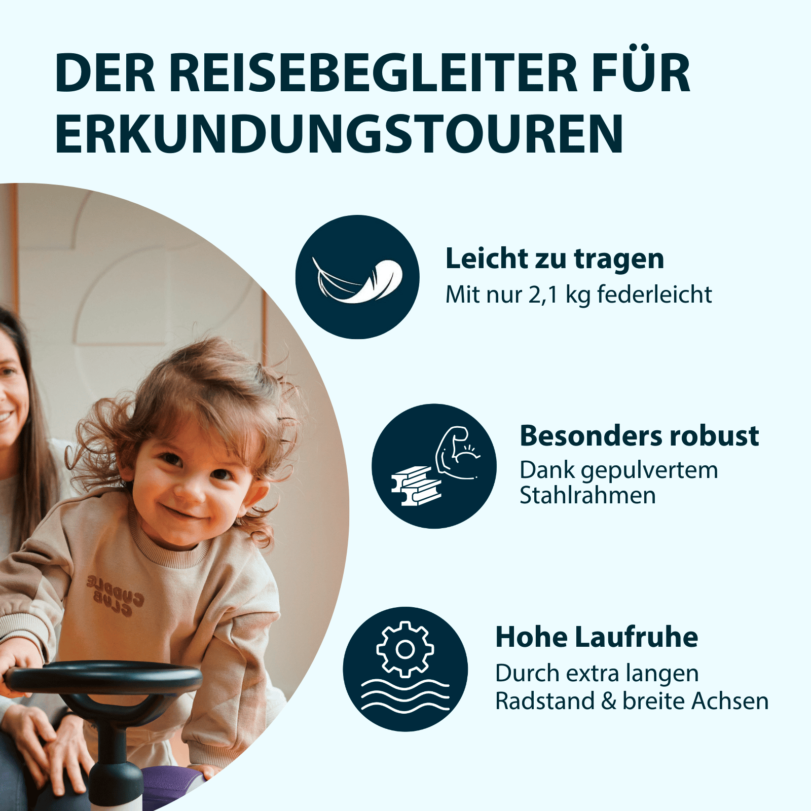 With its four wheels, the Up 6" balance bike ensures maximum stability and safety – perfect for conquering the world step by step. What's special about it: Whisper-quiet wheels guarantee that little riders can always be on the move undisturbed – whether indoors or outdoors. The low weight of just 2.3 kg makes the ride-on extremely handy and easy to transport, while the wide axles and extended wheelbase ensure tip-proof riding fun. Whether as a birthday present or just for fun – the Up 6" balance bike will not only make little adventurers smile, but also their parents. Particularly practical: The Up 6" balance bike is suitable for children from 12 months old – perfect for taking their first steps into the world of mobility. Fun, safety, and quality with the Up 6" balance bike.