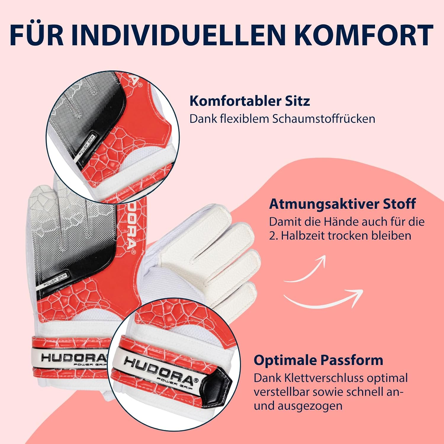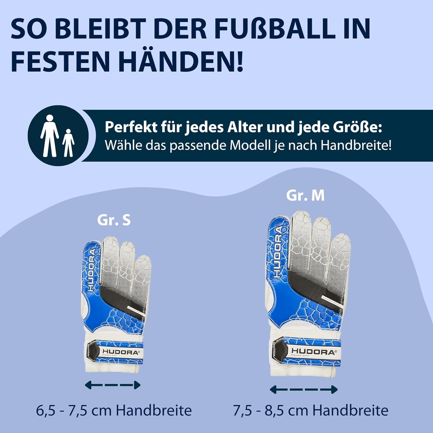 Goalkeeper gloves for children from HUDORA. Breathable gloves with a flexible foam back and a roughened palm for a good grip at all times. Soft, comfortable padding ensures a perfect fit thanks to the optimized fit and practical hook-and-loop closure.
