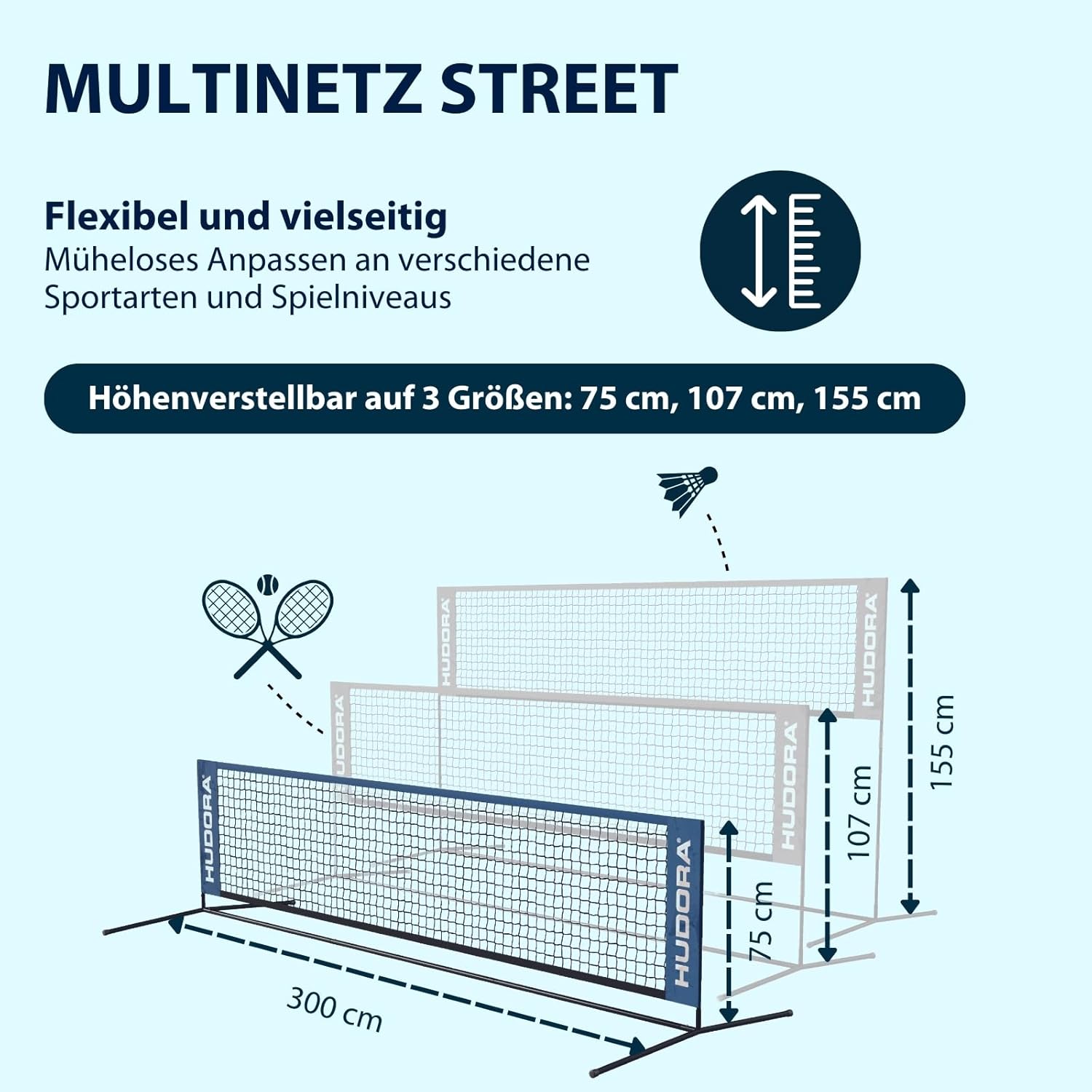 - INDIVIDUAL - Our 3 m wide multi-net can be adjusted to three different heights: 0.75 m for fun, 1.07 m for heated tennis doubles, and 1.55 m for fun badminton matches. Thanks to the carrying bag, it's quick to pack and store away.