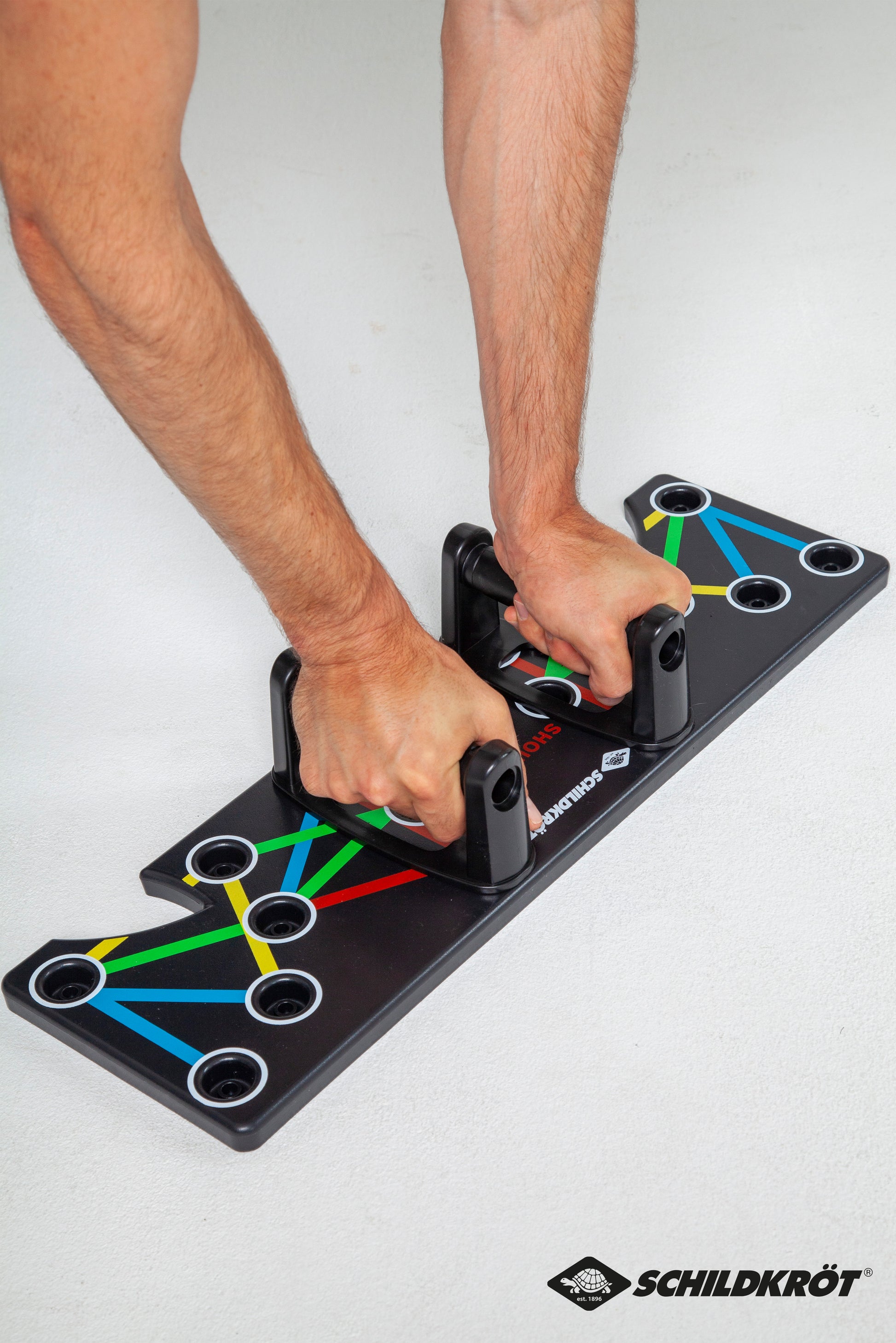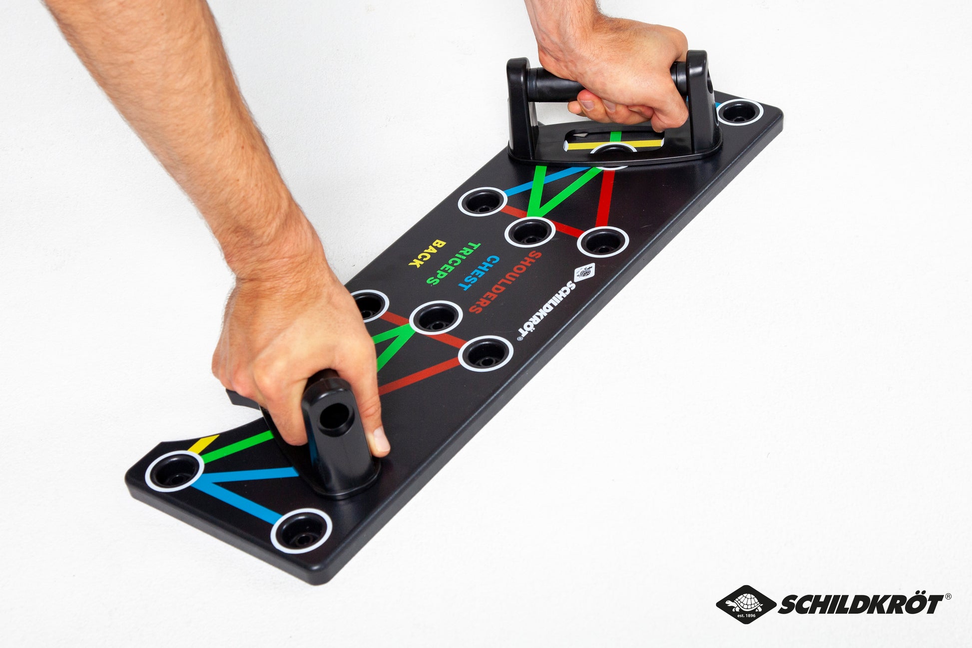 The brand-new push-up multi-trainer from Schildkröt was designed for muscle-building training in the push-up position. An innovative plug-in system with special color coding allows for quick training start. The non-slip handles are inserted into predefined positions on the board. 10 different grip positions allow for targeted, correct training of the chest, shoulder, back, and arm muscles. At the same time, incorrect use and the risk of injury are reduced. The anti-slip pads on the underside ensure a secure footing and also protect the floor. The push-up multi-trainer is the perfect home training device – it is lightweight, handy, and easy to store thanks to its compact size. Maximum load capacity: 120 kg. Set weight: approx. 1.0 kg. Since 2013, the diverse fitness range from the Schildkröt brand has offered a large selection of small fitness equipment for use at home or on the go. Thanks to its high level of recognition, Schildkröt was able to quickly establish itself in the fitness market. Today, renowned specialist retailers cover the small fitness equipment sector with Schildkröt. Furthermore, Schildkröt was recently named "Best Manufacturer" of the Year in the "Fitness" category by German retailers in the SAZ magazine for the third time in a row. Seven years after its market launch, the traditional German brand is completely revamping its brand identity in its fitness segment and presenting a new, dynamic, and appealing packaging concept for 2020. The new look adapts perfectly to current trends and market conditions. As part of the comprehensive brand relaunch, Schildkröt was also able to secure Arnd Peiffer, currently the most successful German biathlete, as its new brand ambassador. Peiffer, born in Lower Saxony and now a Bavarian, can look back on numerous medals, Olympic victories (including Olympic gold in the 10 km sprint in Pyeongchang in 2018), and world championship titles. For his achievements in the 2018/19 season, the reigning world champion was also awarded the Golden Ski, considered the highest honor among German ski athletes. Schildkröt offers a variety of training methods and instructions for its fitness products. Scan the QR code on the packaging or visit our website for tips and training videos.