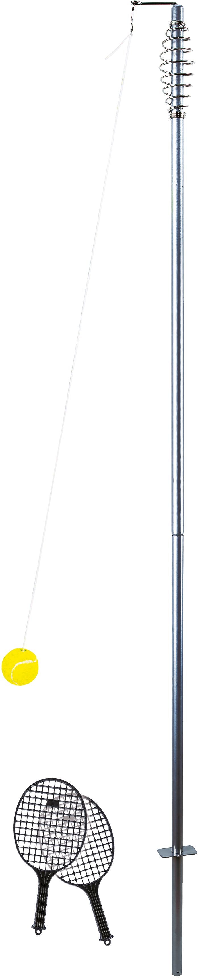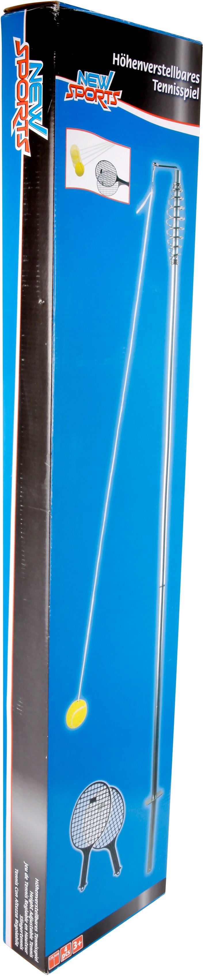 New Sports Tennis Trainer, ist eine Stange die mit einem Tennisball an einer Schnur befestigt ist. Inklusive 2 Plastikschläger ohne Armschlaufen. Befestigung durch Fixierung im Boden. Für Kinder ab 3 Jahren.