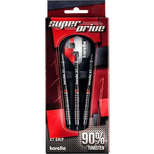 Ausgestattet mit Ringed Grip und Roten Ringen. Der SuperDrive 90% Tungsten 2020 kommt mit einer 26 mm Steel Point Spitze Schwarz, Karella XT Shaft Medium Schwarz und Karella Flights SuperDrive Standard.
