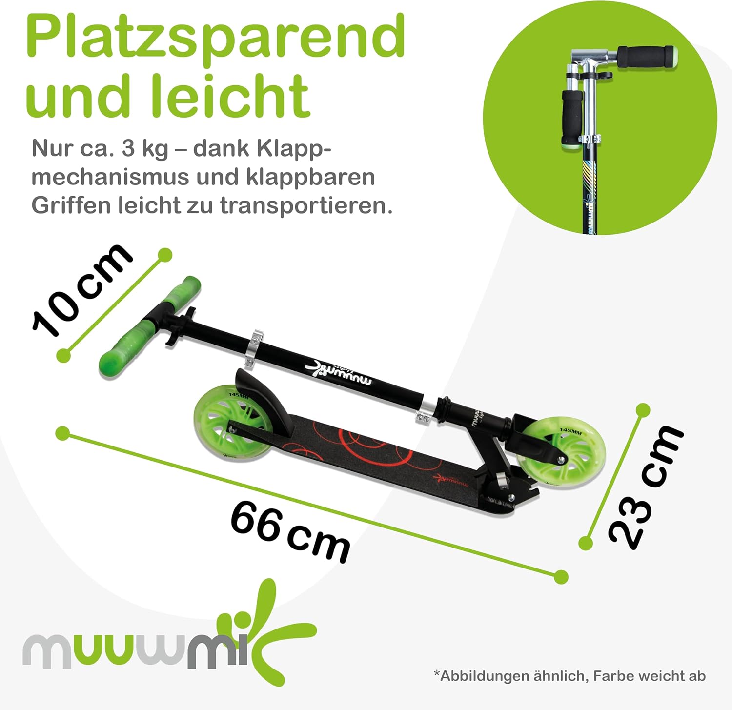 Muuwmi Lights Aluminium Scooter - Höhenverstellbarer Lenker - Geeignet für Kinder - GS-Zertifiziert - Bis zu 100 kg - mit Leuchtrollen - Tretroller in grün-schwarz